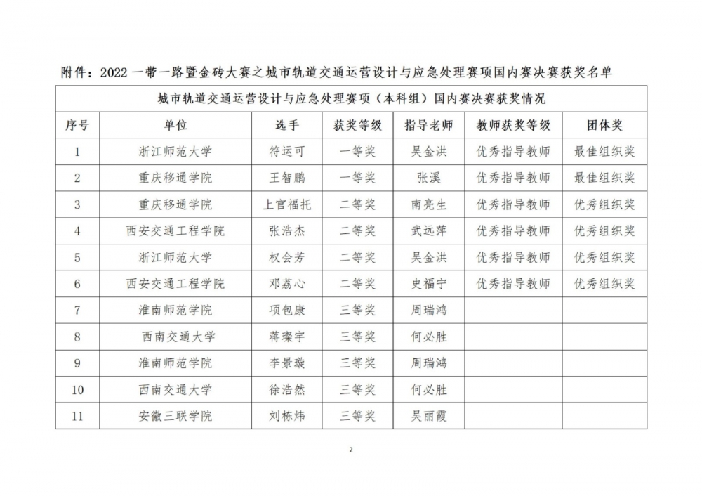 2022一帶一路暨金磚國家技能發展與技術創新大賽之城市軌道交通運營設計與應急處理賽項(本科組)國內賽決賽表彰決定